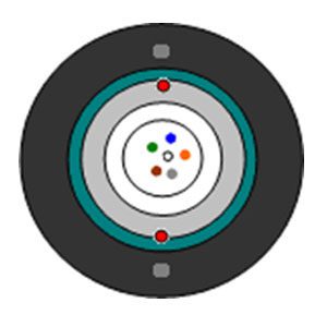 2 – 48 optical fibers, Central gel filling loose tubes, Flexible non-metallic strength member – glass yarn, two rip cords, CSTA armor, Two Steel Wires Embedded in Single PE jacket (black).
